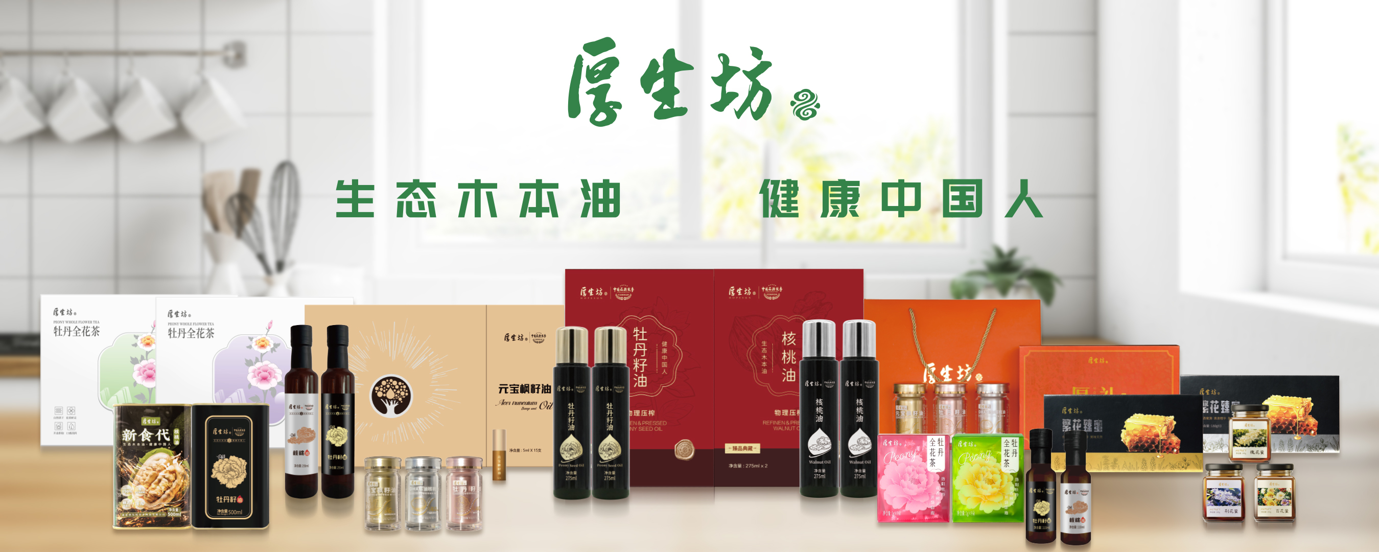 厚生坊產業集團以“生態木本油,健康中國人”為品牌愿景,集農業種植、生產加工和市場服務為一體,主打產品為“三油一花”,即牡丹籽油、核桃油、元寶楓油、牡丹花茶、與天然蜂蜜。厚生坊產業集團專注于“農業種植產業化、加工產業化、銷售產業化”的三產融合發展,活用林地資源,巧用坡耕地資源,大力發展木本經濟作物實現農業產業的可持續發展,從種子到餐桌層層把控產品健康品質,傾心打造“生態”“有機”“綠色”康養國人的健康食品。